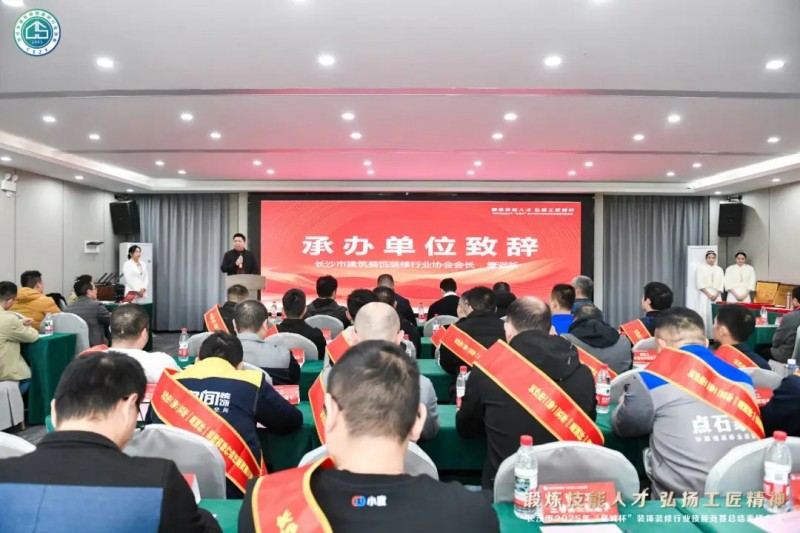 会上,长沙市建筑装饰装修行业协会会长康强新代表承办单位致辞,向获奖选手及单位表示热烈祝贺,他在发言中指出,本届大赛在参赛规模、队伍数量、比赛工种上均实现显著提升,共吸引超40家企业、73名选手同台竞技,比赛工种增至4个。他特别强调:“本次竞赛首次将智能家居技术员纳入正式比赛项目,这在湖南省乃至全国均属首创,充分展现了长沙装饰装修行业与时俱进、开拓创新的决心。”本次比赛共有43名选手获得个人奖项,32家单位荣获团体奖和优秀组织奖,5家单位获得重大活动支持先进单位。