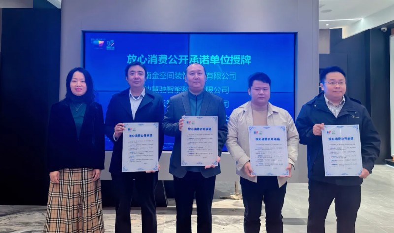 活动现场,长沙市市场监督管理局消保处处长宋洁为湖南金空间装饰工程有限公司、长沙慧驰智能科技有限公司等4家“放心消费公开承诺单位”授牌。随后,金空间装饰及20家入驻企业代表共同宣读了《放心消费公开承诺书》,向社会作出公开承诺。