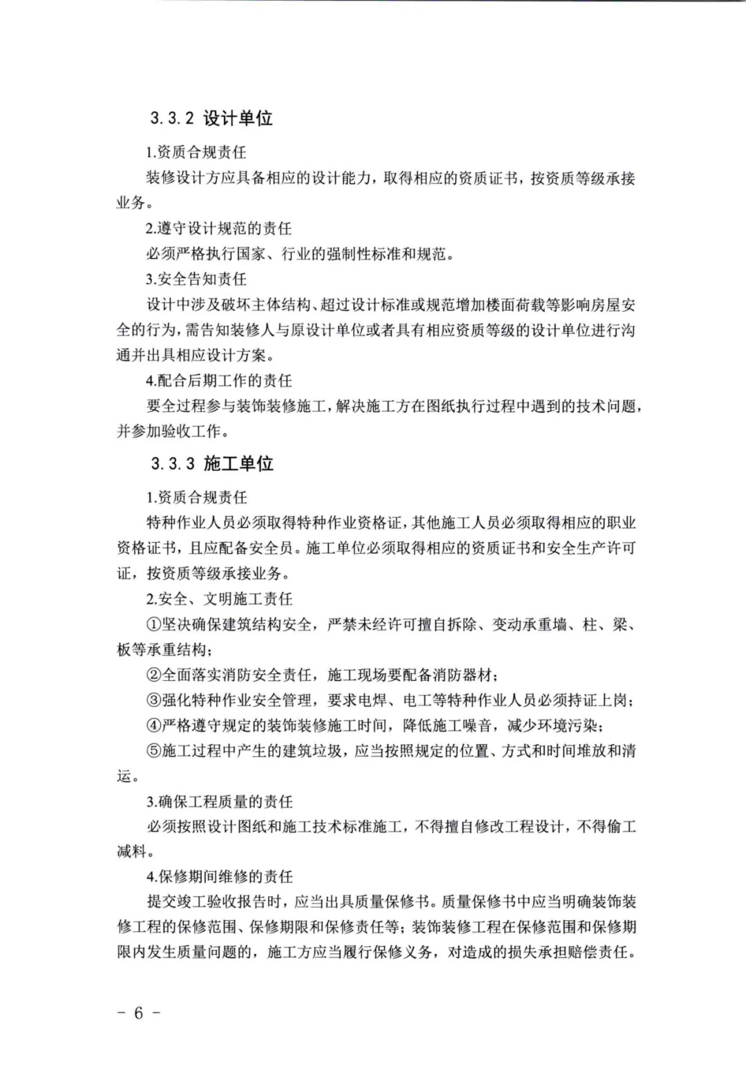 在安全责任划分上,《指南》详细阐述了装修人、设计单位、施工单位及房屋管理单位各自须承担的责任,突出强调了装修人选择合规设计施工方、不擅自变动主体结构,设计施工单位遵守规范、确保质量安全,以及管理单位加强巡查告知等关键义务。