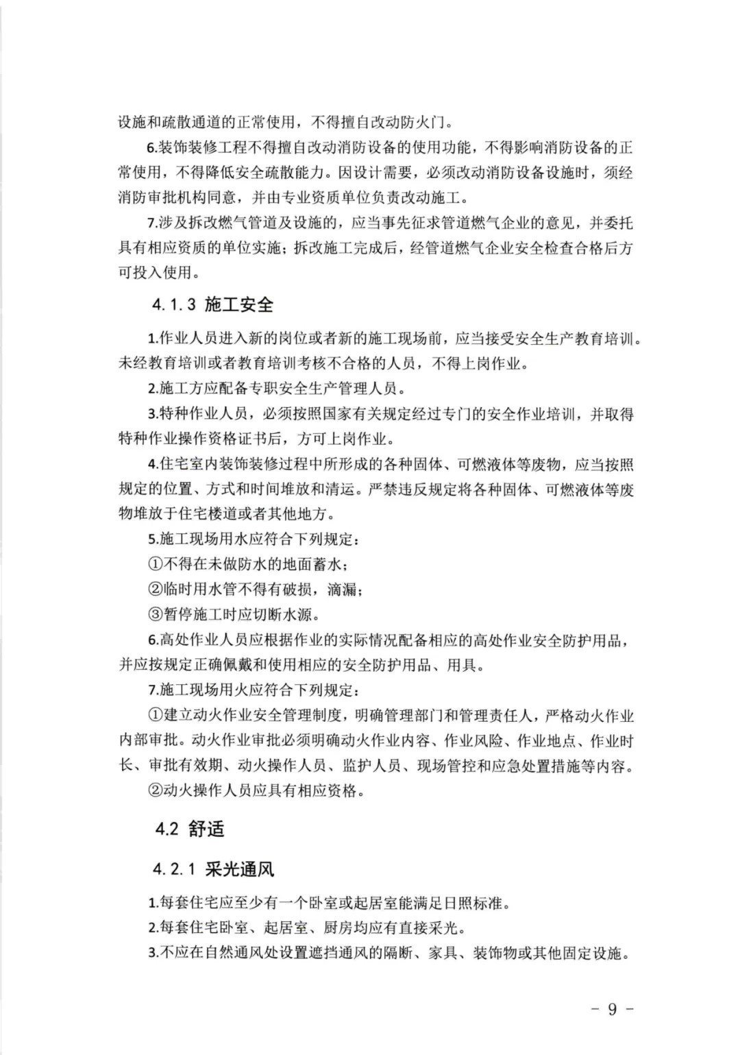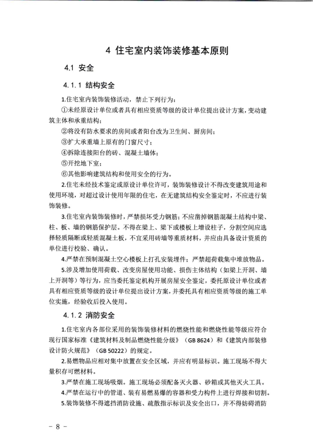 在基本原则部分,《指南》将“安全”置于首位,从结构安全、消防安全、施工安全三个维度提出明确禁令与具体要求,严禁擅自变动建筑主体和承重结构、拆除飘窗、楼板违规开洞、损伤受力钢筋、扩大承重墙门窗尺寸、违规改动房间使用功能等危害房屋安全的行为,并对施工现场消防管理、作业人员资质、动火作业审批等作出严格规定。